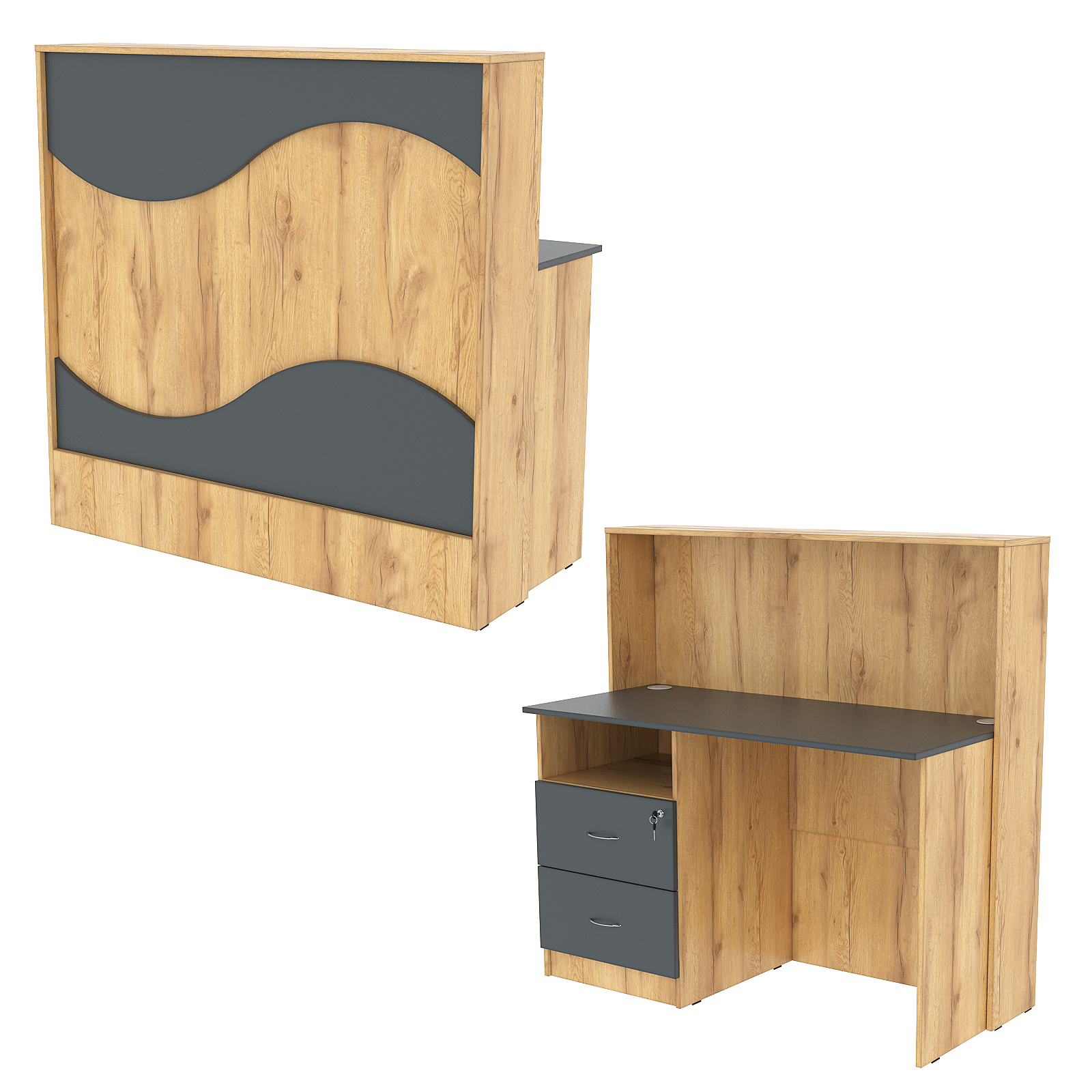 Конструкция состоит из двух предметов: стойки с верхней столешницей и рабочего стола администратора. Стол администратора содержит тумбу с тремя выдвижными ящиками, расположенную слева. Под столешницей имеется небольшое открытое отделение. Каркас выполнен из ЛДСП темного тона. Фасад отделан ЛДСП панелью, имитирующей волну океана. Материал обладает приятными тактильными свойствами и рельефной фактурой.