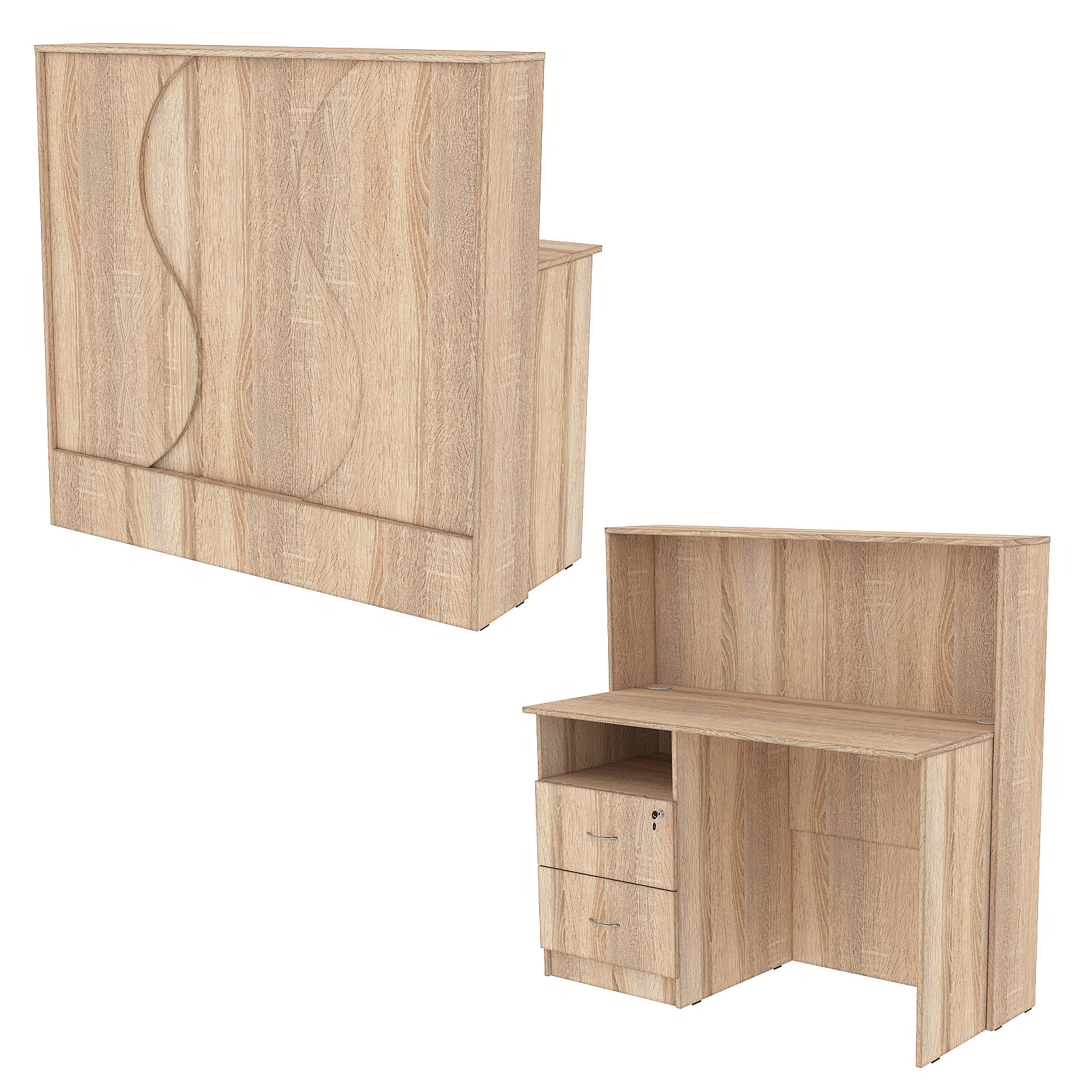 Конструкция состоит из двух предметов: стойки с верхней столешницей и рабочего стола администратора. Стол администратора содержит тумбу с тремя выдвижными ящиками, расположенную слева. Под столешницей имеется небольшое открытое отделение. Каркас выполнен из ЛДСП темного тона. Фасад отделан ЛДСП панелью, имитирующей волну океана. Материал обладает приятными тактильными свойствами и рельефной фактурой.