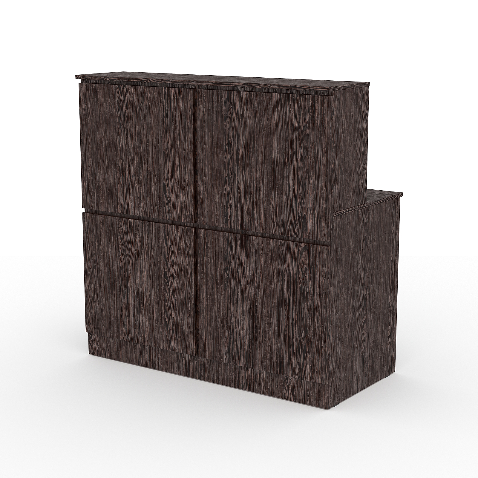 Данная модель ресепшн отличается своеобразным дизайном, выполненном в темно-коричневой гамме. Передняя панель отделана декоративной пластиковой панелью, имитирующей камень. Каркас выполнен из ДСП. Конструкция состоит из двух столешниц. На передней панели под верхней столешницей имеется место для размещения логотипа компании.