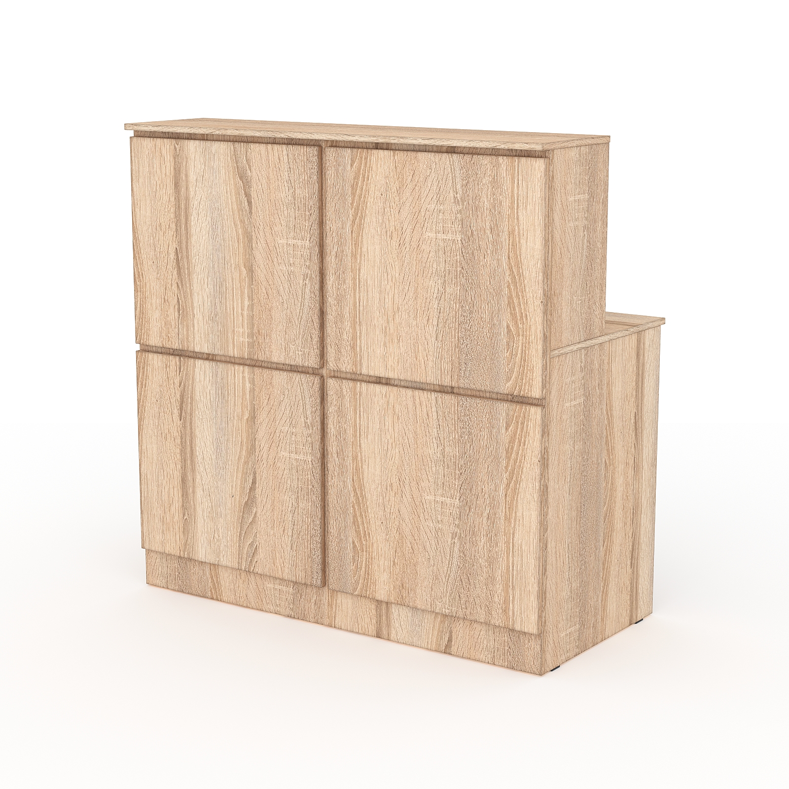 Данная модель ресепшн отличается своеобразным дизайном, выполненном в темно-коричневой гамме. Передняя панель отделана декоративной пластиковой панелью, имитирующей камень. Каркас выполнен из ДСП. Конструкция состоит из двух столешниц. На передней панели под верхней столешницей имеется место для размещения логотипа компании.