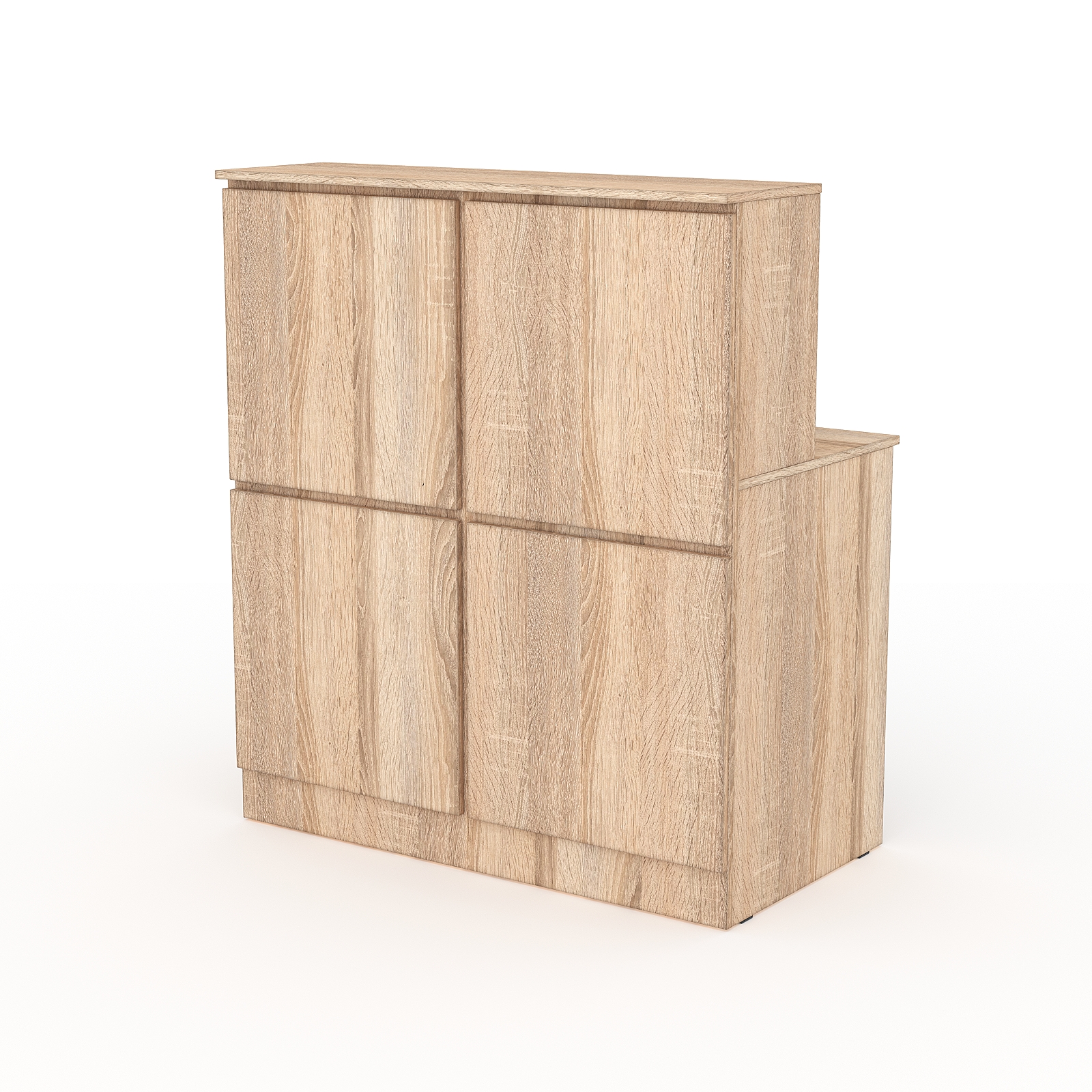 Данная модель ресепшн отличается своеобразным дизайном, выполненном в темно-коричневой гамме. Передняя панель отделана декоративной пластиковой панелью, имитирующей разноцветную кирпичную кладку. Каркас выполнен из ДСП. Конструкция состоит из двух столешниц. На передней панели под верхней столешницей имеется место для размещения логотипа компании.