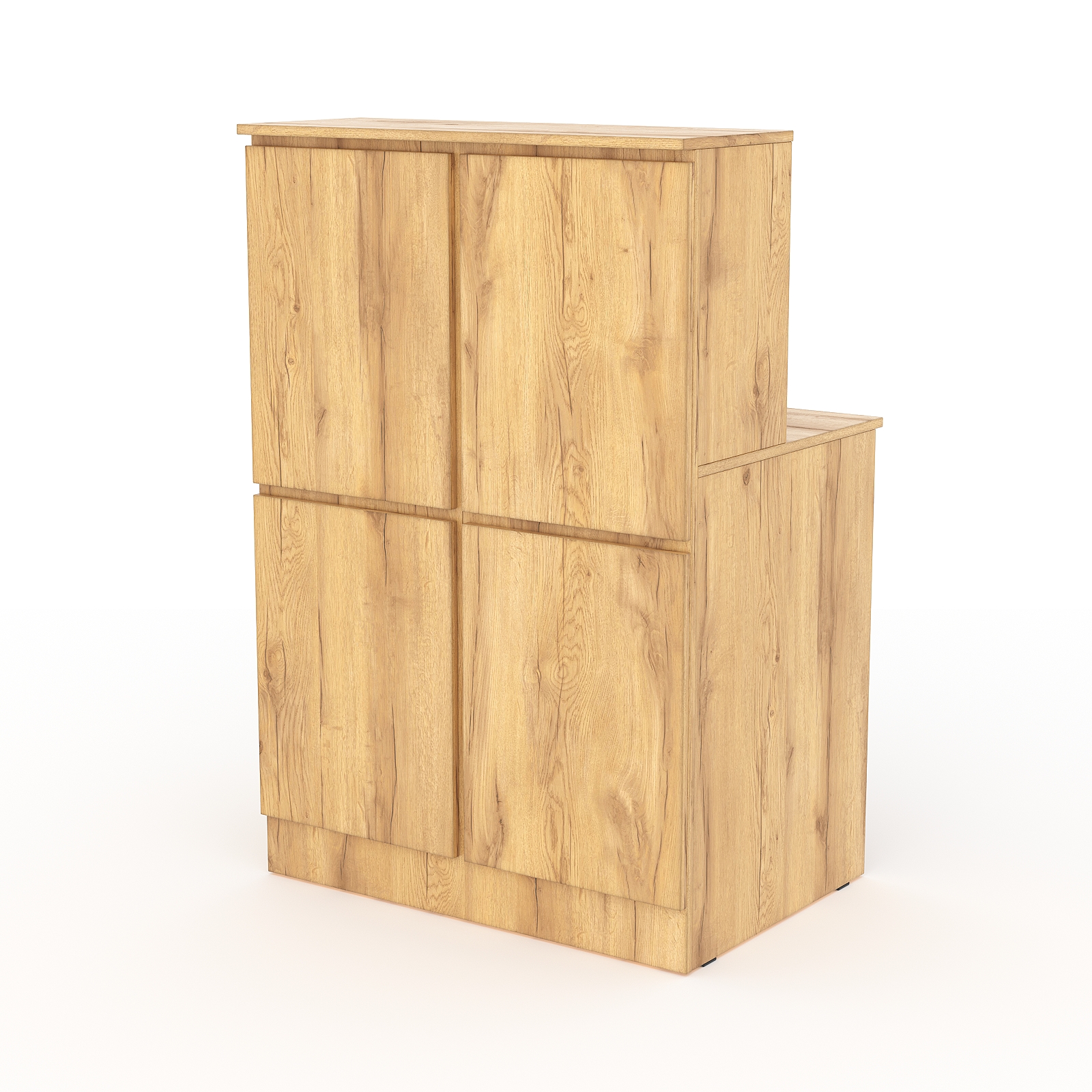Данная модель ресепшн отличается своеобразным дизайном, выполненном в темно-коричневой гамме. Передняя панель отделана декоративной пластиковой панелью, имитирующей кладку из серого кирпича. Каркас выполнен из ДСП. Конструкция состоит из двух столешниц. На передней панели под верхней столешницей имеется место для размещения логотипа компании.
