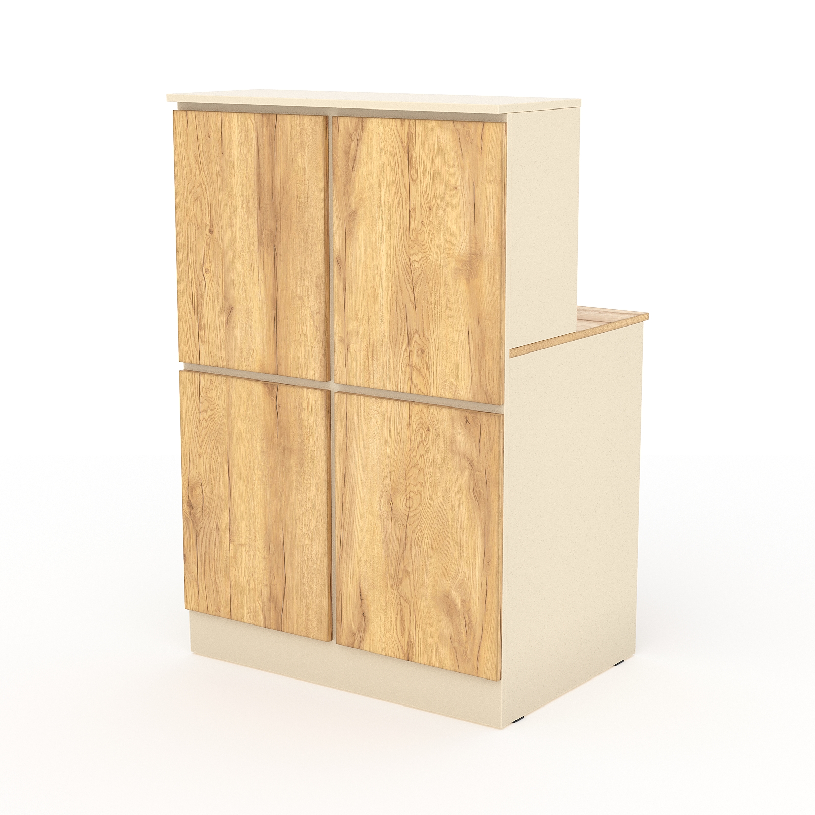 Данная модель ресепшн отличается своеобразным дизайном, выполненном в темно-коричневой гамме. Передняя панель отделана декоративной пластиковой панелью, имитирующей кладку из серого кирпича. Каркас выполнен из ДСП. Конструкция состоит из двух столешниц. На передней панели под верхней столешницей имеется место для размещения логотипа компании.
