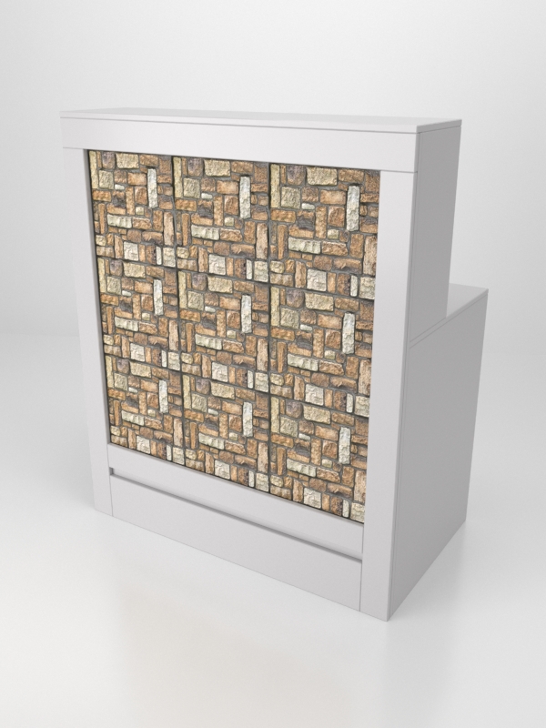 Каркас стойки выполнен из ЛДСП. Фасадная часть отделана декоративной пластиковой панелью, имитирующей камень.