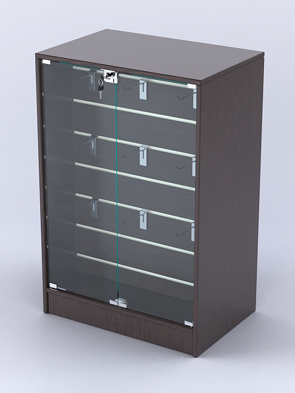Конструкция прилавка разработана для выкладки предметов кожгалантереи. Демонстрационная панель оборудована крючками. Для представления товара покупателю спереди прилавка имеются дверки. С внутренней стороны располагается накопитель с распашными дверями. Все двери прилавка закрываются на ключ.