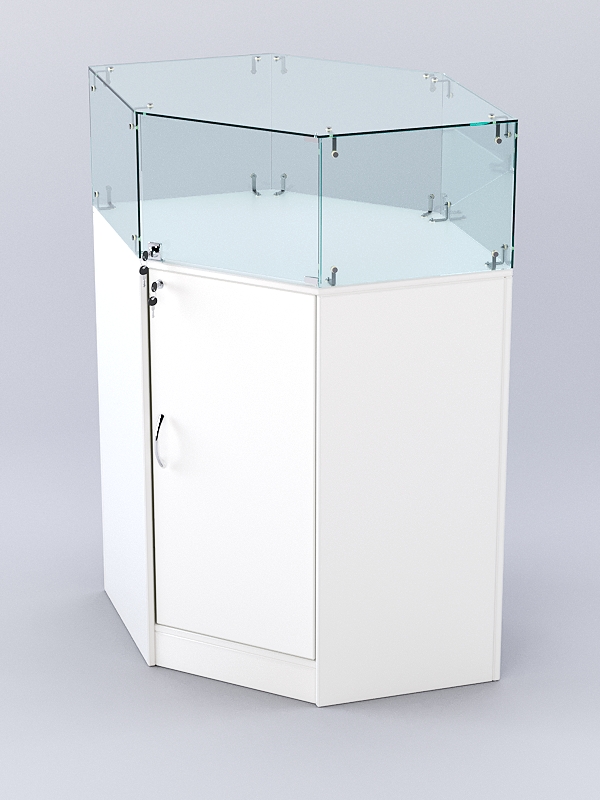 Оригинальный шестигранный прилавок подойдет для выкладки кожгалантерейных изделий, а также дорогих аксессуаров.