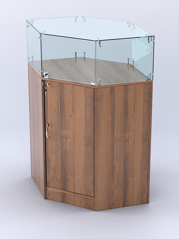 Оригинальный шестигранный прилавок подойдет для выкладки кожгалантерейных изделий, а также дорогих аксессуаров.
