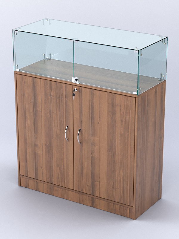 Каркас выполнен из ЛДСП двух цветов. Корпус витрины — стеклянный.