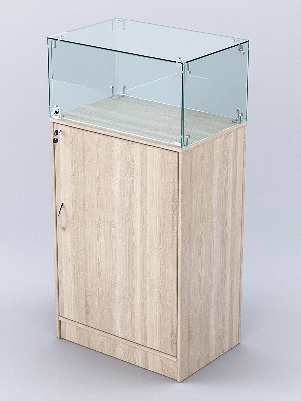 Каркас выполнен из ЛДСП двух цветов. Корпус витрины — стеклянный.