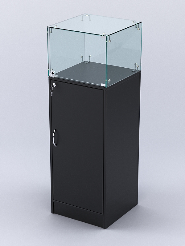 Каркас выполнен из ЛДСП двух цветов. Корпус витрины — стеклянный.