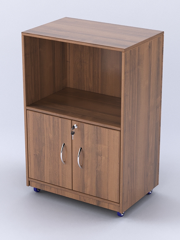 Фасад прилавка является закрытым. С внутренней стороны имеется отделение для инвентаря и накопитель с распашными дверками.