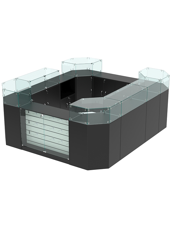 В комплект входят 4 шестигранных прилавка, 2 широких прилавка с витриной, 2 широких прилавка с демонстрационной панелью, узкий прилавок с витриной и выкатной прилавок.