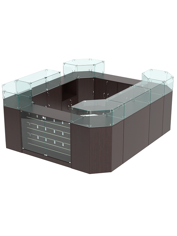В комплект входят 4 шестигранных прилавка, 2 широких прилавка с витриной, 2 широких прилавка с демонстрационной панелью, узкий прилавок с витриной и выкатной прилавок.