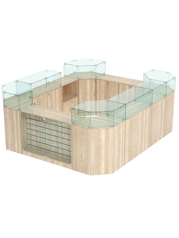 В комплект входят 4 шестигранных прилавка, 2 широких прилавка с витриной, 2 широких прилавка с демонстрационной панелью, узкий прилавок с витриной и выкатной прилавок.