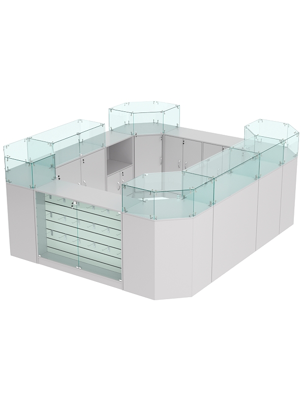 В комплект входят 4 шестигранных прилавка, 2 широких прилавка с витриной, 2 широких прилавка с демонстрационной панелью, узкий прилавок с витриной и выкатной прилавок.