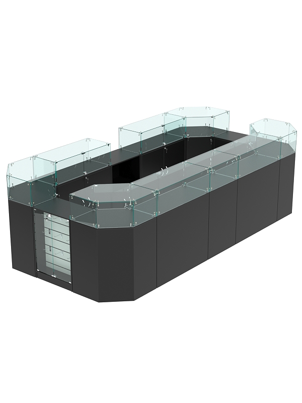 В комплект входят 4 шестигранных прилавка, 2 широких прилавка с демонстрационной панелью, 2 широких прилавка с витриной, узкий прилавок с витриной и выкатной прилавок.