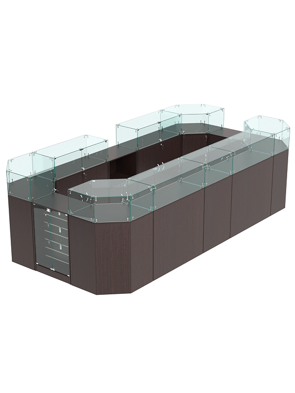 В комплект входят 4 шестигранных прилавка, 2 широких прилавка с демонстрационной панелью, 2 широких прилавка с витриной, узкий прилавок с витриной и выкатной прилавок.