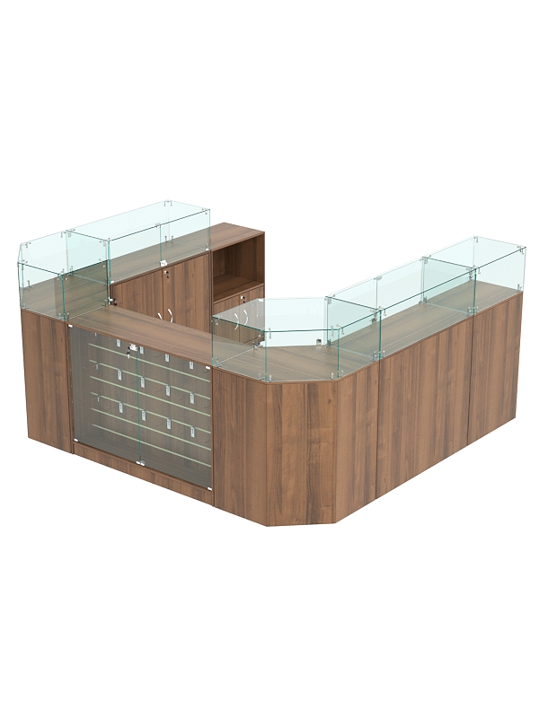 Каркас выполнен из ЛДСП двух цветов. Корпус витрин — стеклянный.