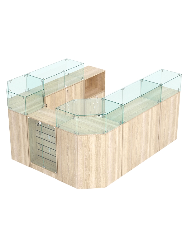 Каркас выполнен из ЛДСП двух цветов. Корпус витрин — стеклянный.
