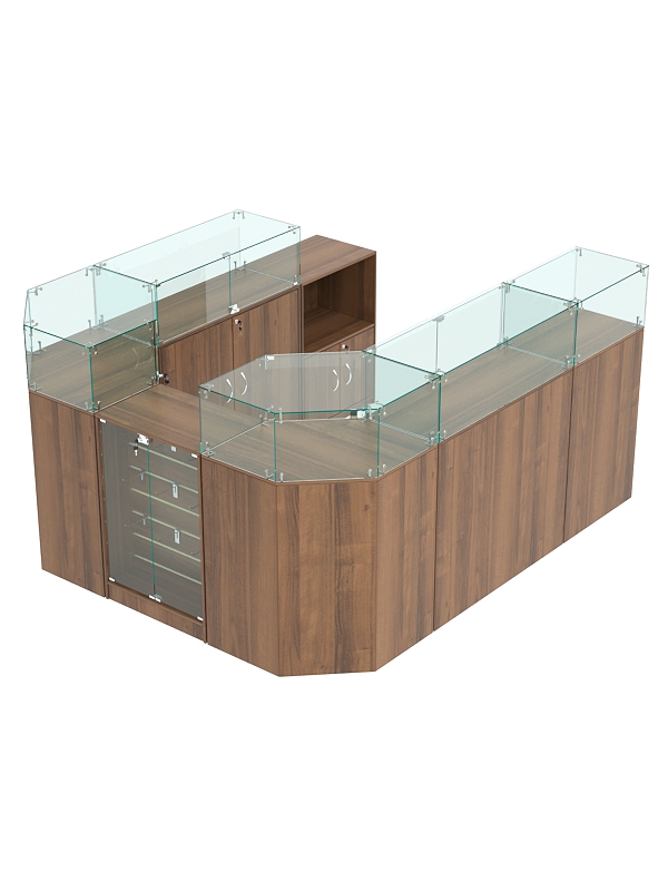 Каркас выполнен из ЛДСП двух цветов. Корпус витрин — стеклянный.