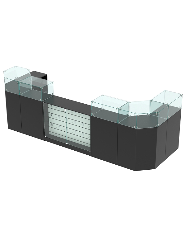 В комплект входят 2 шестигранных прилавка, широкий прилавок с демонстрационной панелью, 3 узких прилавка с витриной и выкатной прилавок.
