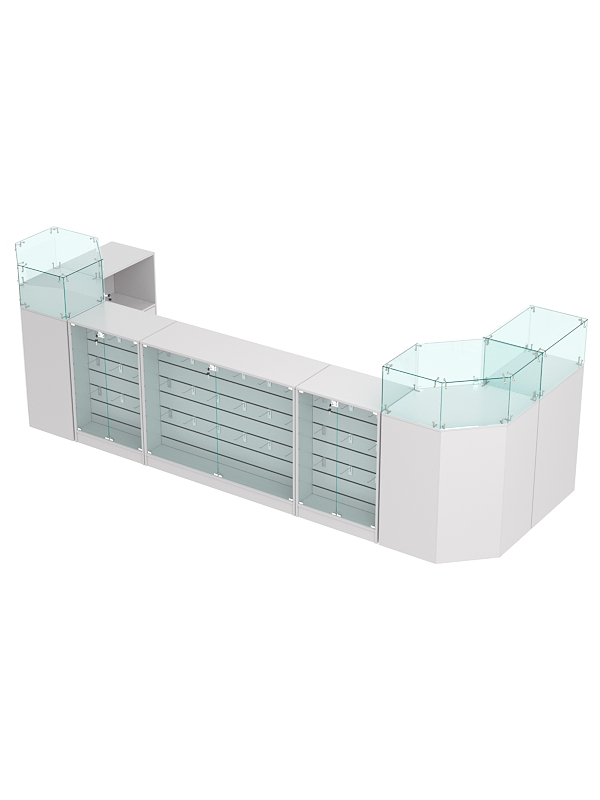 В комплект входят 2 шестигранных прилавка, широкий прилавок с демонстрационной панелью, 2 узких прилавка с демонстрационной панелью, узкий прилавок с витриной и выкатной прилавок.