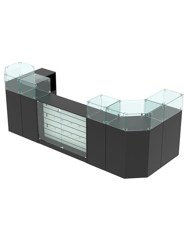 В комплект входят 2 шестигранных прилавка, широкий прилавок с демонстрационной панелью, 2 квадратных прилавка с витриной, узкий прилавок с витриной и выкатной прилавок.