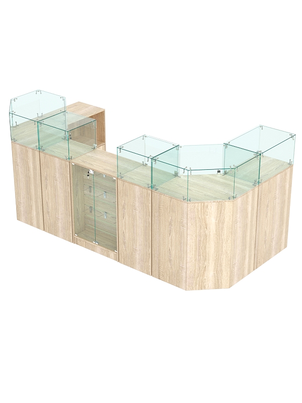 В комплект входят 2 шестигранных прилавка со стеклянным куполом, 2 узких прилавка со стеклянным куполом, 1 прилавок кассира с экономпанелью, 1 прилавок со стеклянным куполом и выкатной прилавок.