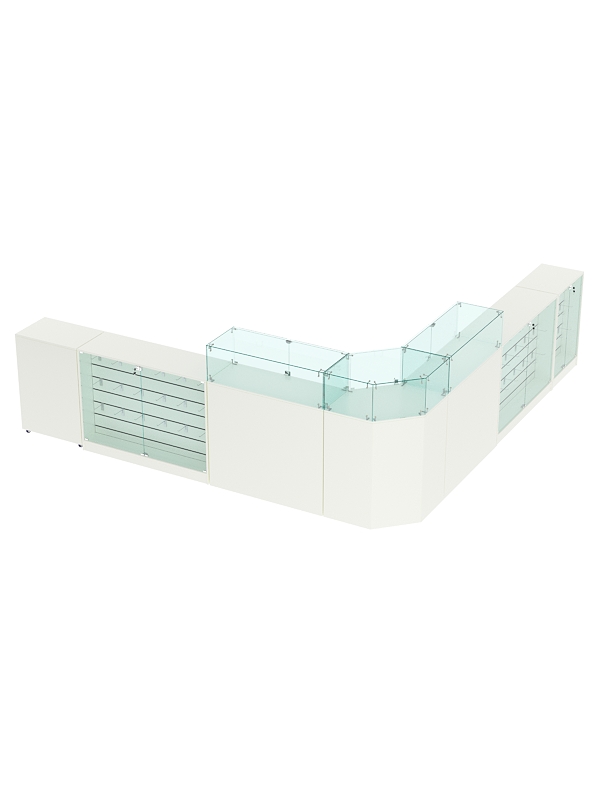 В комплект входят шестигранный прилавок, 2 широких прилавка с витриной, 2 широких прилавка с демонстрационной панелью, 1 узкий прилавок с демонстрационной панелью и выкатной прилавок.