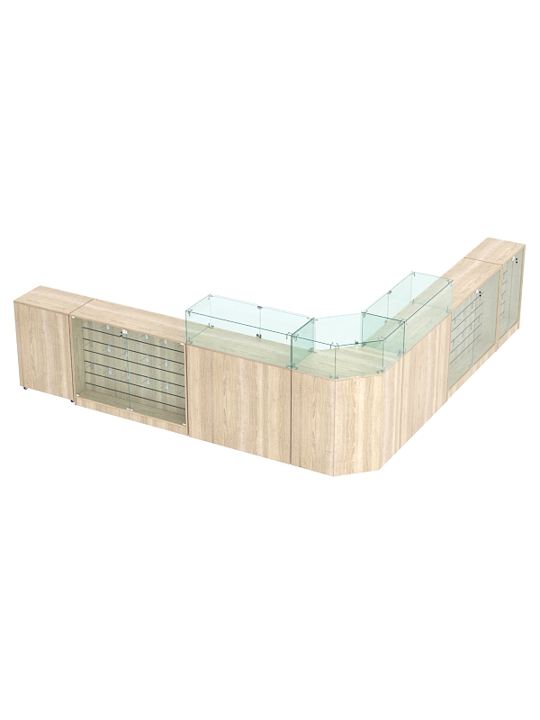 В комплект входят шестигранный прилавок, 2 широких прилавка с витриной, 2 широких прилавка с демонстрационной панелью, 1 узкий прилавок с демонстрационной панелью и выкатной прилавок.