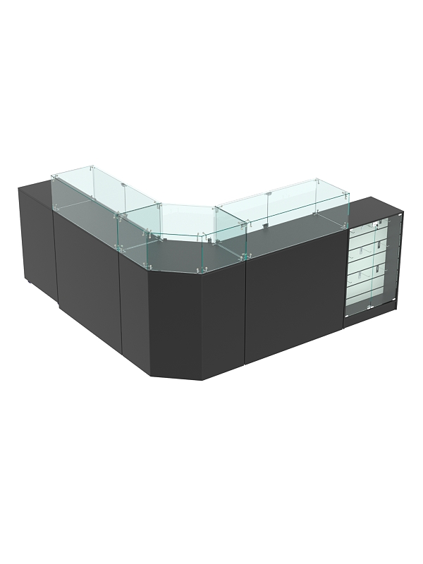 В комплект входят шестигранный прилавок, 2 широких прилавка с витриной, узкий прилавок с демонстрационной панелью и выкатной прилавок.