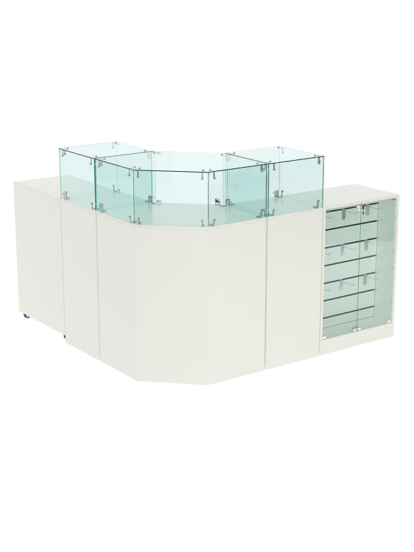 В комплект входят шестигранный прилавок, 2 квадратных прилавка с витриной, узкий прилавок с демонстрационной панелью и выкатной прилавок.