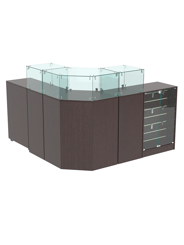 В комплект входят шестигранный прилавок, 2 квадратных прилавка с витриной, узкий прилавок с демонстрационной панелью и выкатной прилавок.