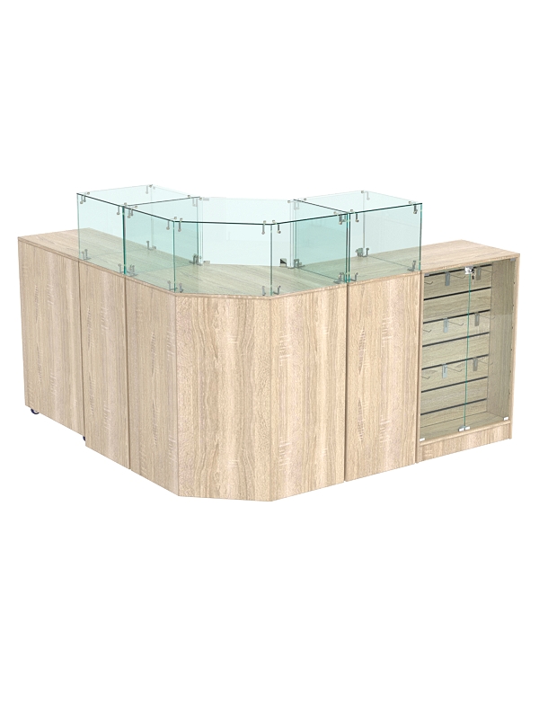 В комплект входят шестигранный прилавок, 2 квадратных прилавка с витриной, узкий прилавок с демонстрационной панелью и выкатной прилавок.