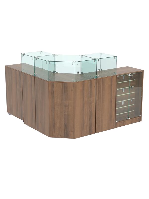 В комплект входят шестигранный прилавок, 2 квадратных прилавка с витриной, узкий прилавок с демонстрационной панелью и выкатной прилавок.