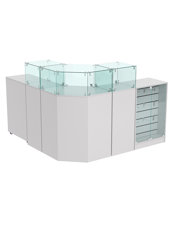 В комплект входят шестигранный прилавок, 2 квадратных прилавка с витриной, узкий прилавок с демонстрационной панелью и выкатной прилавок.