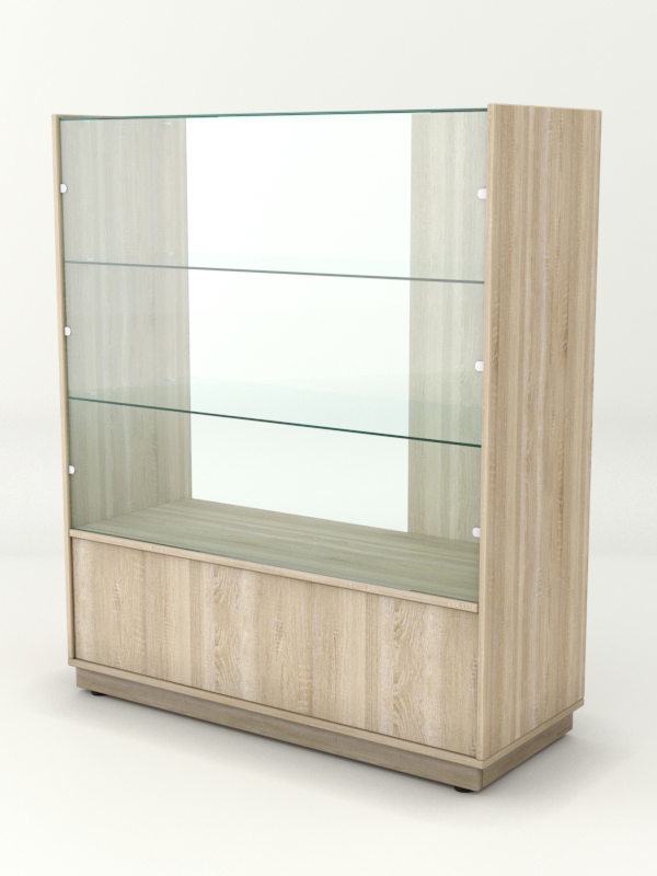 Прилавок предназначен для демонстрации и хранения чайно-кофейной продукции. Конструкция включает стеклянную витрину с двумя полками и накопитель. Прилавок открыт внутри, справа от продавца. Слева находится стенка из ДСП. Цвет корпуса можно заказать в семи стандартных вариантах, а также подобрать в палитре на заказ.