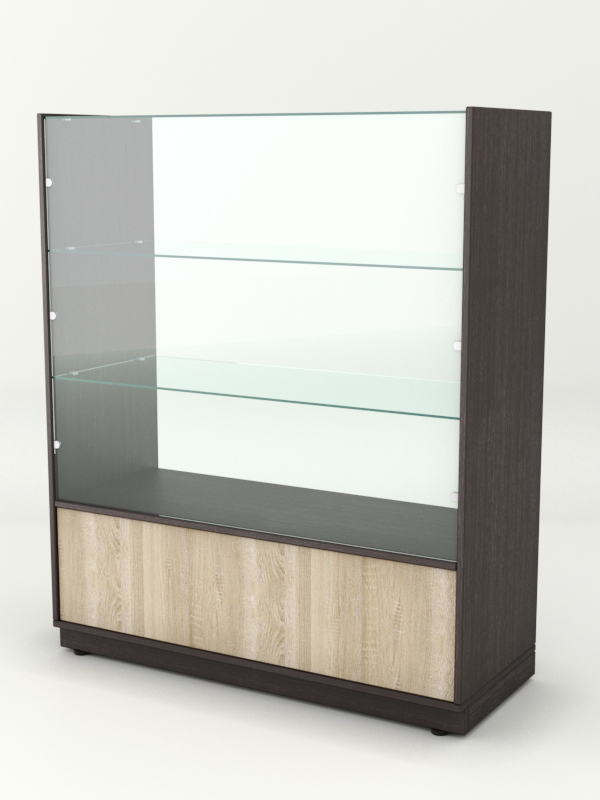 Прилавок предназначен для демонстрации и хранения чайно-кофейной продукции. Конструкция включает стеклянную витрину с двумя полками и накопитель. Прилавок открыт с внутренней стороны. Цвет корпуса можно заказать в семи стандартных вариантах, а также подобрать в палитре на заказ.