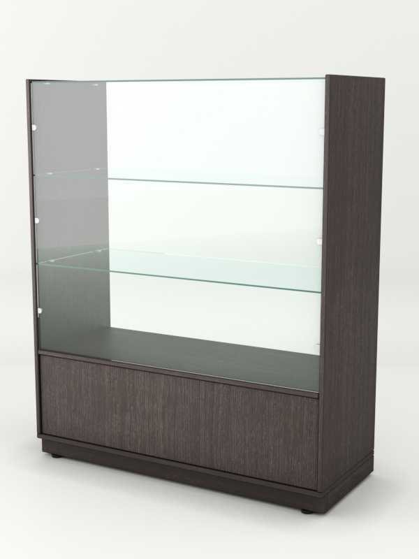 Прилавок предназначен для демонстрации и хранения чайно-кофейной продукции. Конструкция включает стеклянную витрину с двумя полками и накопитель. Прилавок открыт с внутренней стороны. Цвет корпуса можно заказать в семи стандартных вариантах, а также подобрать в палитре на заказ.