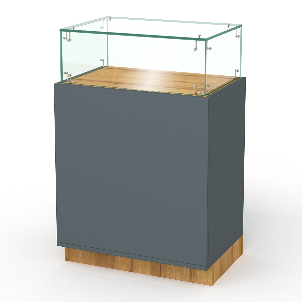 Конструкция состоит из витрины и накопителя с полкой. Дверцы накопителя закрываются на ключ.
