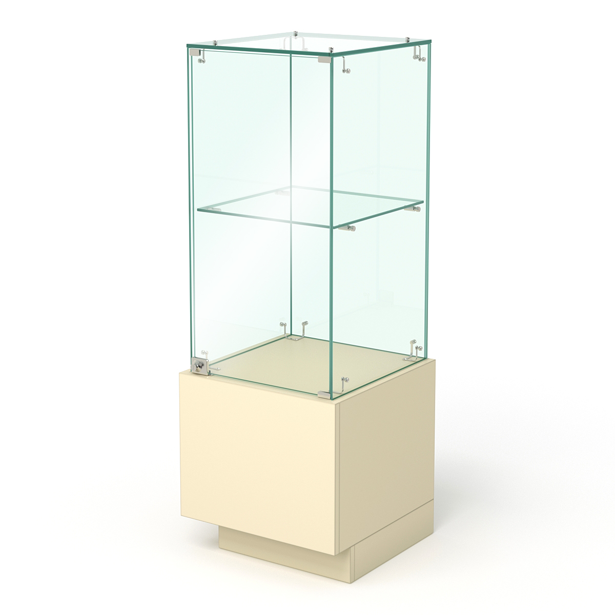 Конструкция состоит из подиума и витрины с полкой. Дверца витрины расположена под правую руку продавца.