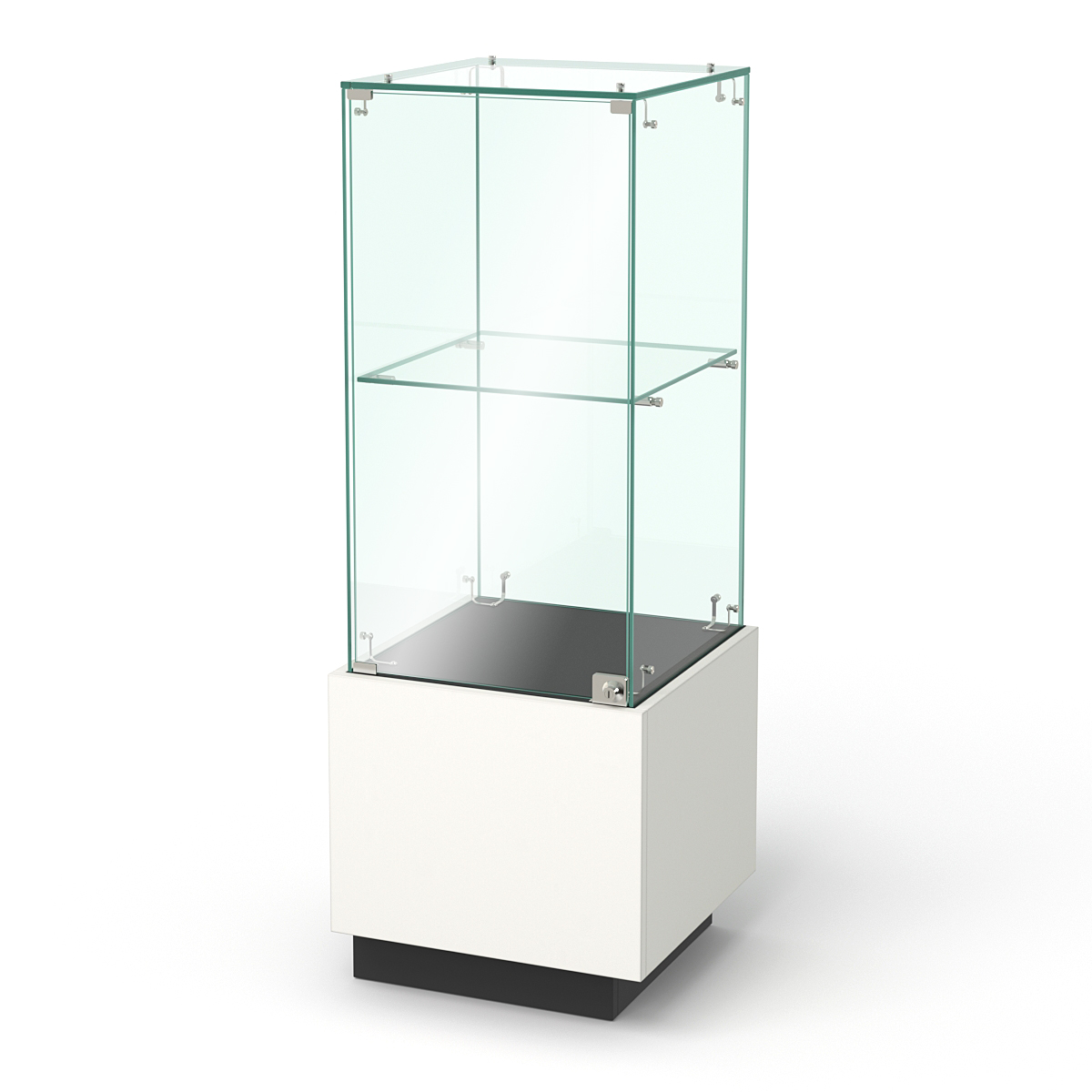 Конструкция состоит из подиума и витрины с полкой. Дверца витрины расположена под левую руку продавца.