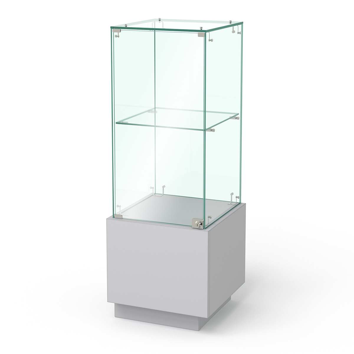 Конструкция состоит из подиума и витрины с полкой. Дверца витрины расположена под левую руку продавца.