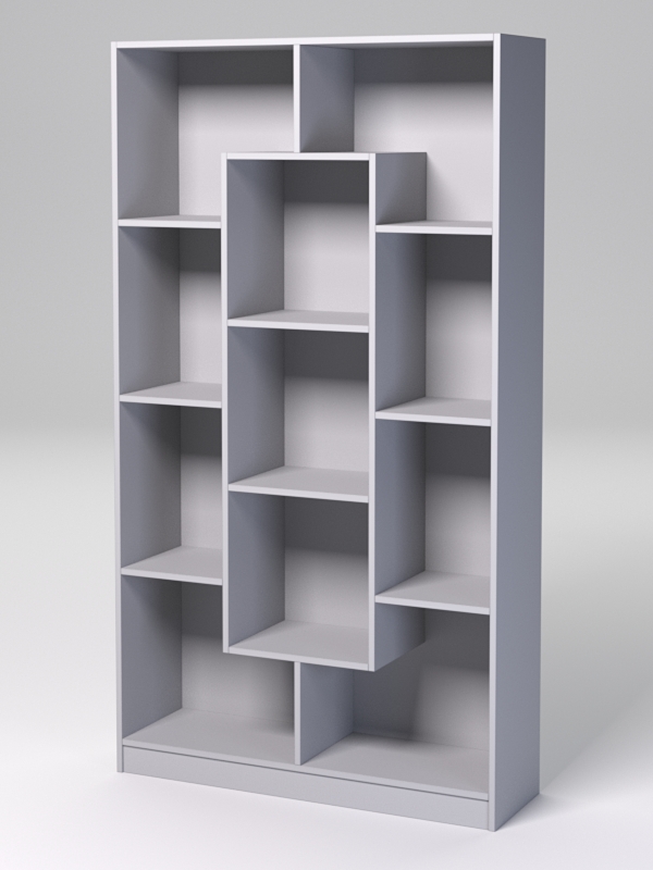 Разместить книги, детские игрушки, предметы обихода поможет практичный и уютный стеллаж. Конструкция состоит из двух секций, включающих по три полки. В центре находится еще одна секция, с двумя полками.