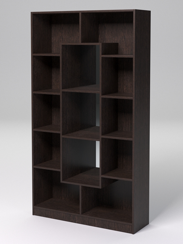 Разместить книги, детские игрушки, предметы обихода поможет практичный и уютный стеллаж. Конструкция состоит из двух секций, включающих по четыре полки. В центре находится еще одна секция, с двумя полками и зеркальной стенкой.