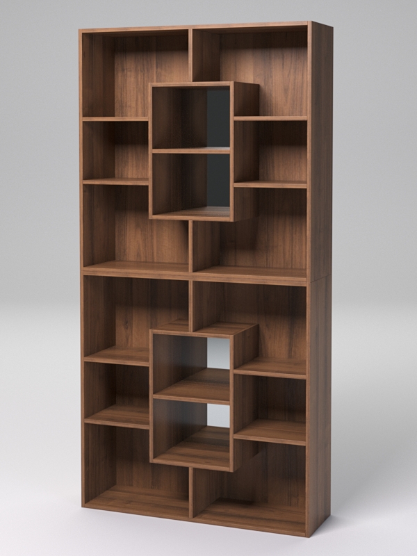 Разместить книги, детские игрушки, предметы обихода поможет практичный и уютный стеллаж. Конструкция состоит из двух отделений, расположенных одно над другим. В центре каждого отделения находится секция с полкой и зеркальной стенкой. Каждое отделение содержит восемь ячеек.
