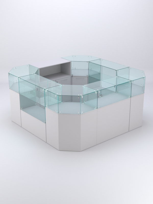 Комплект включает 2 прямоугольных прилавка с полкой, прямоугольный прилавок без полки, 4 шестиугольных прилавка, закрытый прилавок.