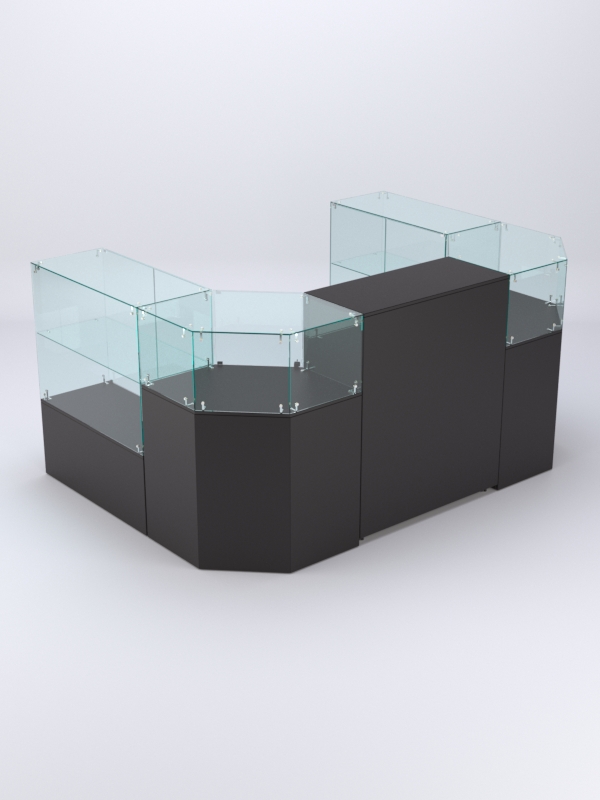 Комплект включает 2 прямоугольных прилавка с полкой, 2 шестиугольных прилавка, закрытый прилавок.