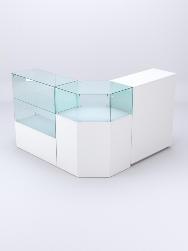 Комплект включает прямоугольный прилавок с полкой, шестиугольный прилавок и закрытый прилавок.