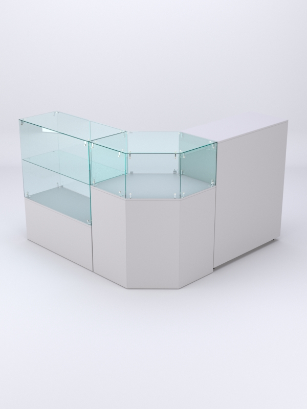 Комплект включает прямоугольный прилавок с полкой, шестиугольный прилавок и закрытый прилавок.